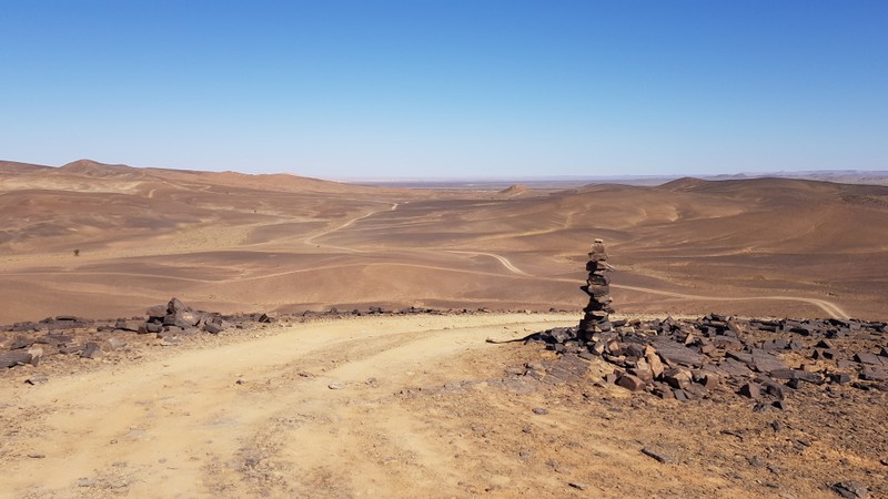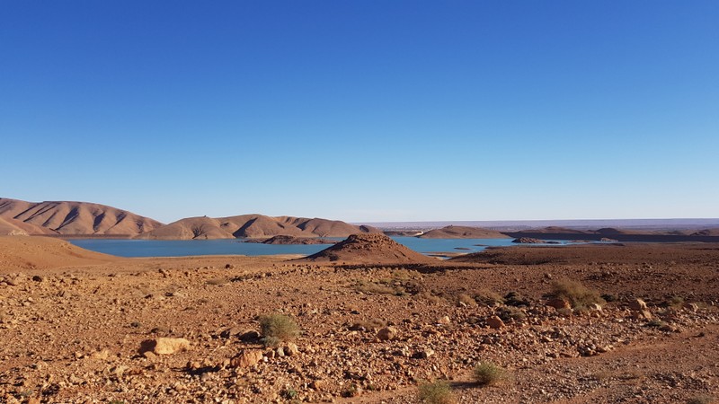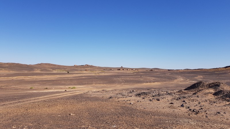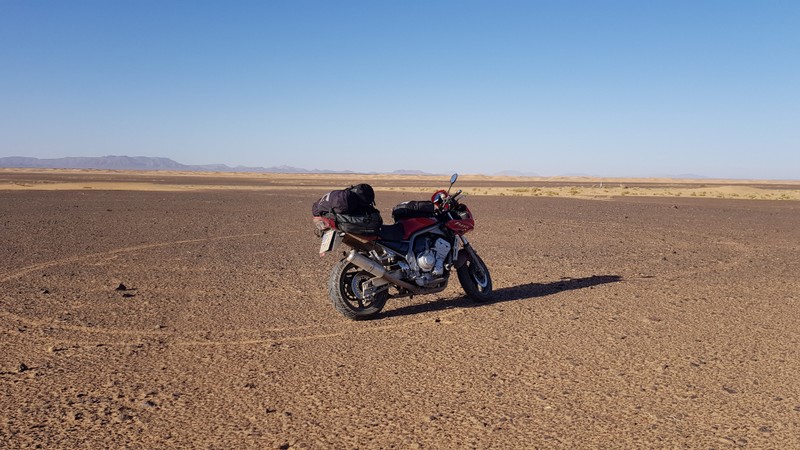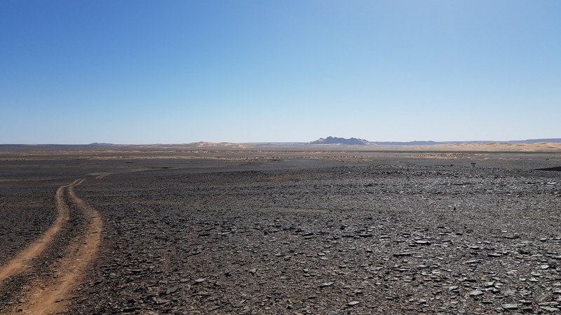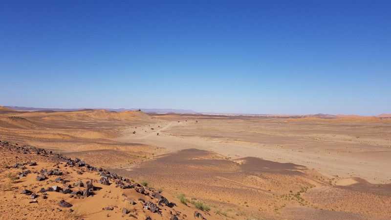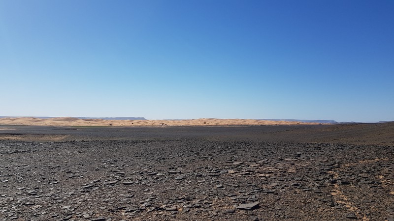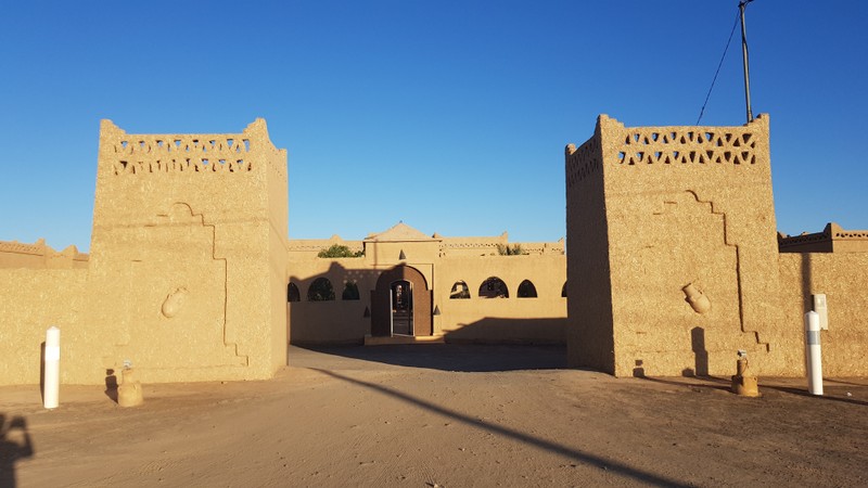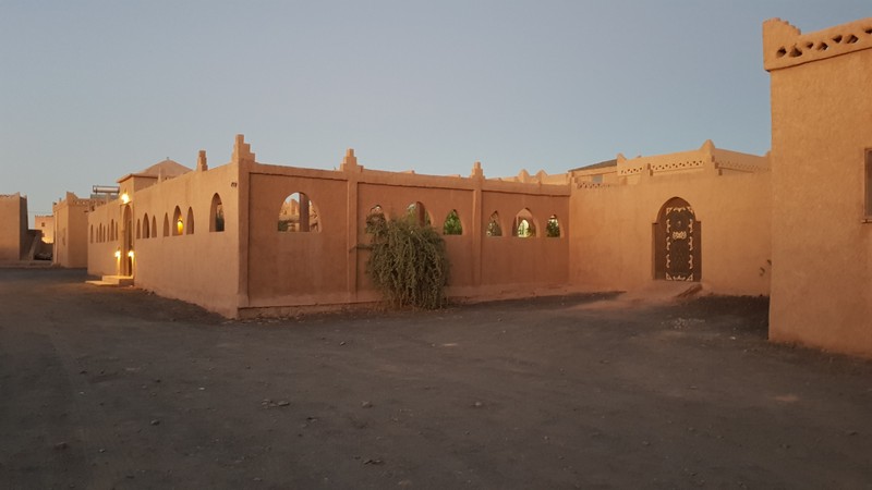 Die Route über „Midelt“ nach „Errachidia“ erwies sich durch ihre guten Straßenverhältnisse und auch landschaftlich als eine gute Wahl. Ab „Er-Rich“ fuhr ich bei etwa 20°C bergwärts an einem Fluss entlang an dem immer wieder Palmenoasen aus dem Boden wuchsen und so erreichte ich langsam aber sicher die steinige Wüste. Die letzten Stunden fuhr ich mit weitem Blick in den Sonnenuntergang und erreichte nach 7 Stunden reiner Fahrzeit das Hotel „Les Portes du Desért“ bei „Merzouga“. Dieser Tag steckte mir so sehr in den Knochen, dass ich einfach nur froh war den Tag mit Duschen, Essen und Schlafen zu beenden.