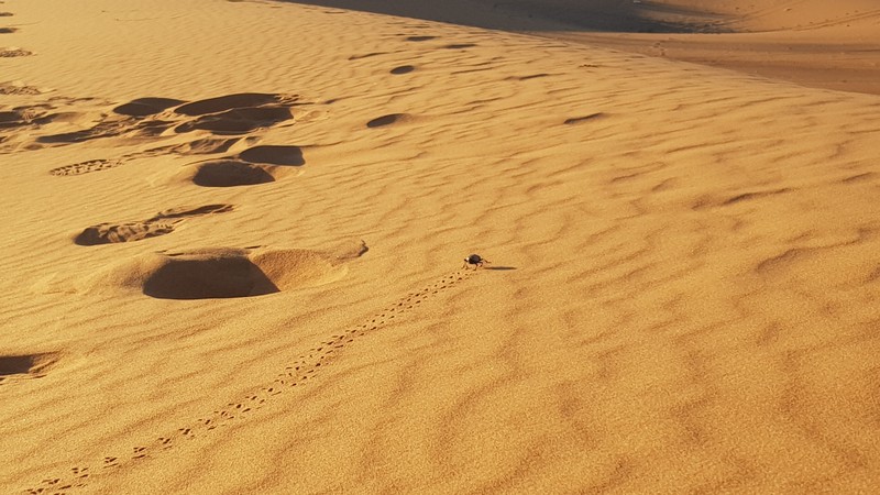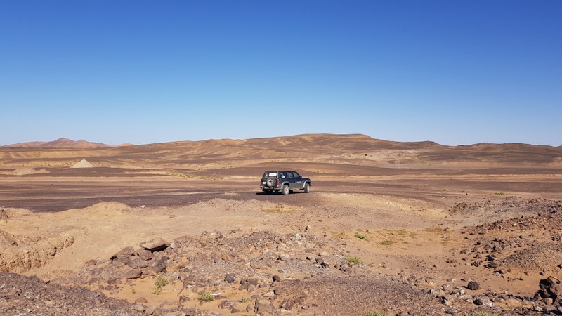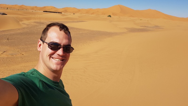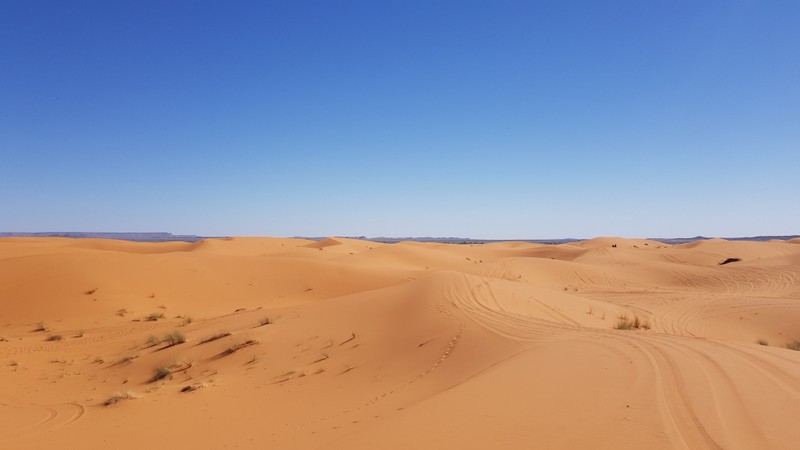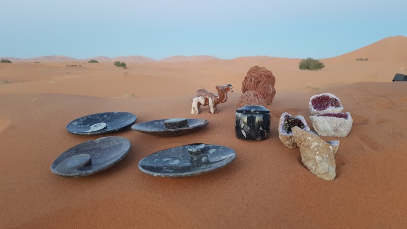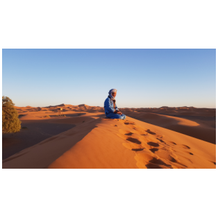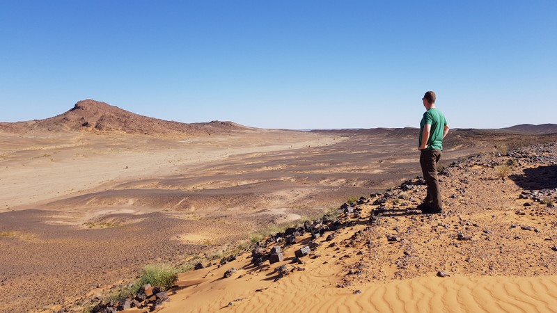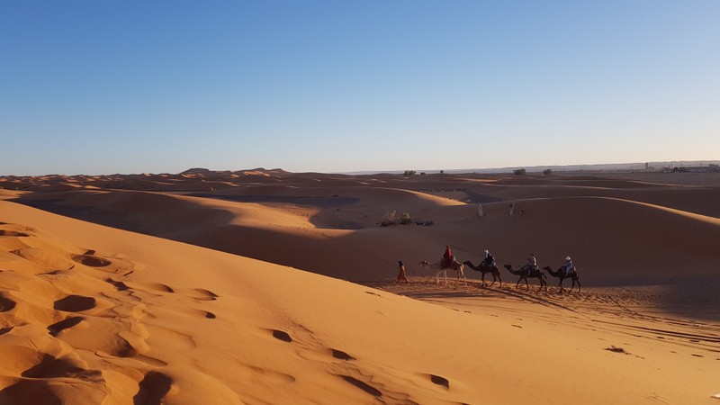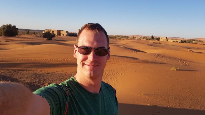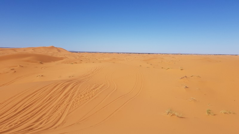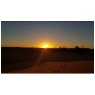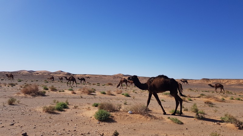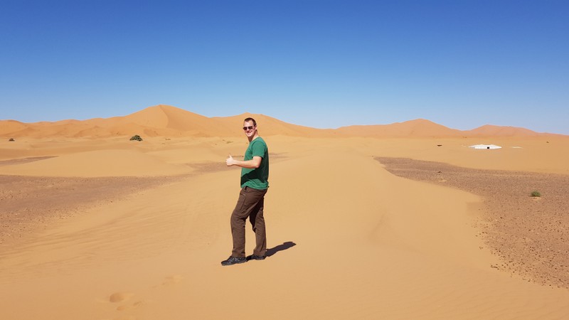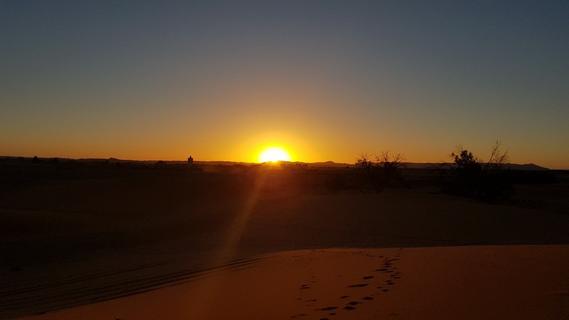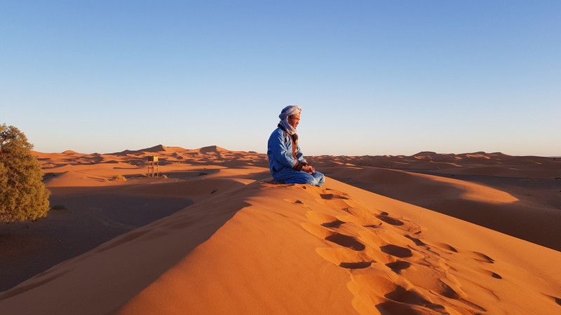 Der Sonntag blieb Motorradfrei und ich mietete mir einen Geländewagen mit englischsprachigem Fahrer um nicht mein geliebtes Motorrad in den Sand setzen zu müssen. Wir fuhren zu einem kleinen Dorf, wo eine Gruppe einheimischer traditionelle Musik machte. Mein Reiseführer zeigte mir wo und wie Kristalle in der Gegend gewonnen werden. Er zeigte mir die Grenze nach Algerien und fuhr mit mir durch verschiedenste Wüstenabschnitte bis in die tiefen Sanddünen. Natürlich bekam ich auch noch eine Kamelherde zu sehen und genoss den Sonnenuntergang auf einer Düne direkt hinter dem Hotel. Als sich unerwartet ein Berber in meine Nähe setzte und gleiches Tat fotografierte ich ihn wie er still und scheinbar glücklich in die letzten Sonnenstrahlen des Tages blickte. Ich knipste damit mein „Foto der Reise“, da es für mich Marokko in voller Natürlichkeit darstellt.