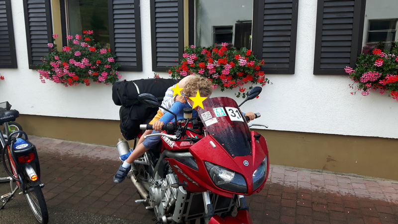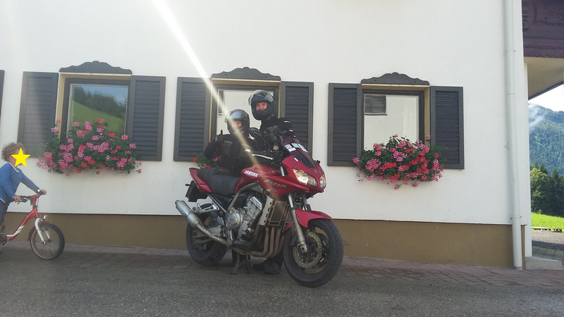 Ausgeschlafen am Frühstücken auf der Terrasse hörte man nur die Glocken der Kühe und die spielenden Kinder. Aus dem Sonnenschein entwickelten sich schnell dunkle Wolken, welche uns mit Blitz und Donner ihre stärke spüren ließen. Also blieben wir lieber an der Hütte und setzten uns zusammen mit Miriam zu Jasper und Theo, zum Lego spielen. In jedem Erwachsenen steckt halt auch immer ein Kind. Als der Regen vorüber ging war für Jasper und Theo „Motorradfahren“ angesagt. Mit riesigen Kinderaugen und einer menge Phantasie ging es durch die Serpentinen. Aber auch Miriam liebäugelte mit diesem Erlebnis. Deutlicher ging es nicht. Also Gepäck runter, Motorradkleidung an und ab ging es 40 km aller „Jochen Schweizer“mit Miriam auf dem Sozius durch die anliegenden Bergstraßen. Ob sie bald auch über ein Motorrad plus Führerschein nachdenkt weiß ich nicht. Aber ihr strahlendes Gesicht wird sich den ganzen Tag nicht gelegt haben.
