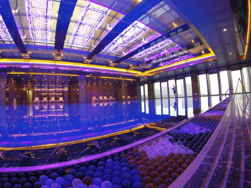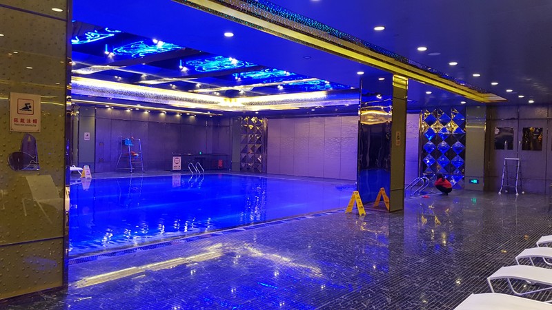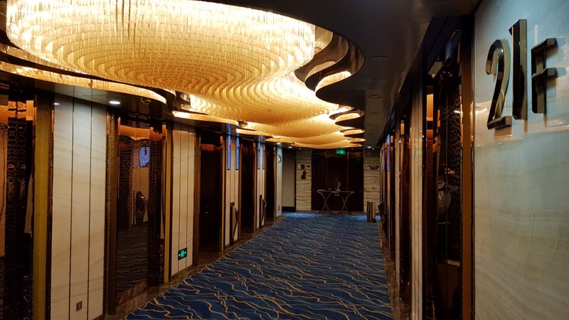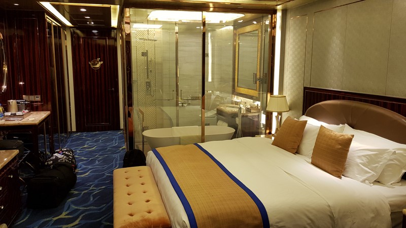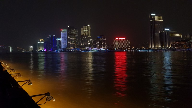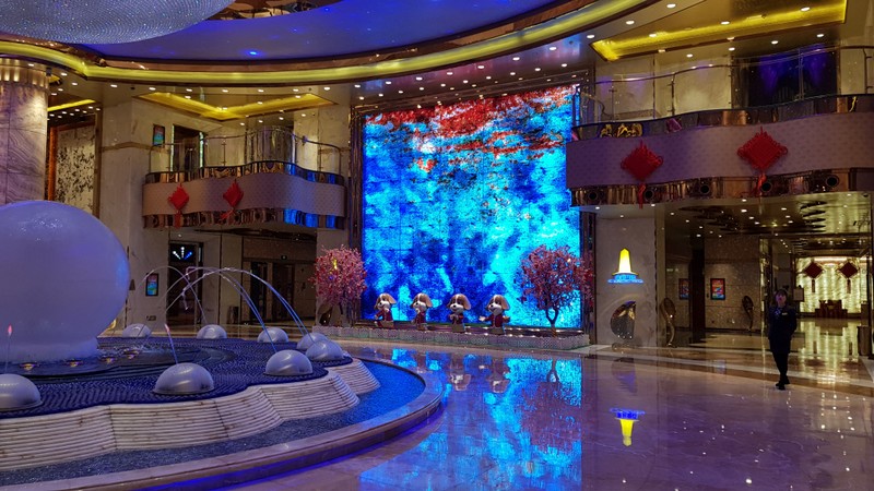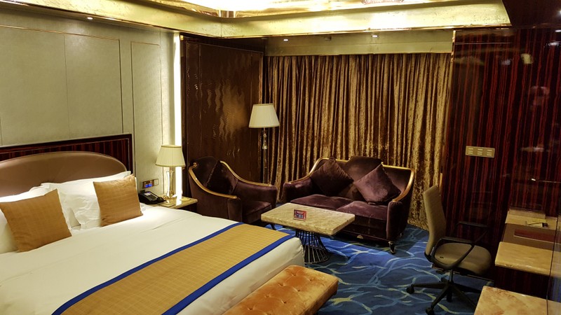 „Gold Nugget Hotel“ der Name war Programm alles egal ob innen oder außen an dem vierzig stöckigen Gebäude leuchtete oder funkelte in allen Farben. Das Zimmer im 21. Stock konnte sich sehen lassen. Ein riesiges Doppelbett in dem ich mir aussuchen konnte ob ich längst oder quer liegen möchte, eine angenehme Sofaecke, ein großer Flachbildschirm, ein Schreibtisch, ein komfortables Bad mit Badewanne und ebenerdiger Dusche und natürlich alles vollautomatisch. Von jeder Ecke des Zimmers kann man irgendwie das Licht einstellen oder auch die Gardinen steuern. Nicht zu vergessen die vollautomatische Toilette. Einfach witzig die Chinesen.