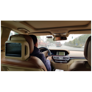 in meiner Arbeitskleidung in einer Mercedes S-Klasse als Langversion