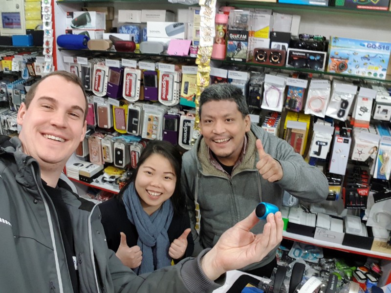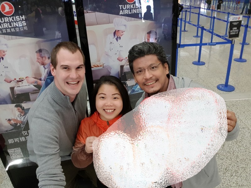 Ich fuhr zum Flughafen und freute mich schon am Samstagabend ein paar Freunde in der Heimat zu sehen. Doch der Weg war nicht leicht. Die Autobahnen nach Shanghai waren verstopft und ich kam auf den letzten Drücker am Flughafen an. Meine „Dealer“ Mac und Ada waren sogar so nett und haben ihren Laden früher geschlossen um mir mein Zeug vom Fakemarket inkl. der “Shanghai-Penis-Bundeswehrlacher-Postkarte für Jumbo“ zum Flughafen zu bringen. Kurz die Koffer neu gepackt, die Postkarte verschickt, ein Selfie mit meinen Freunden und auf ging es in den Flieger.