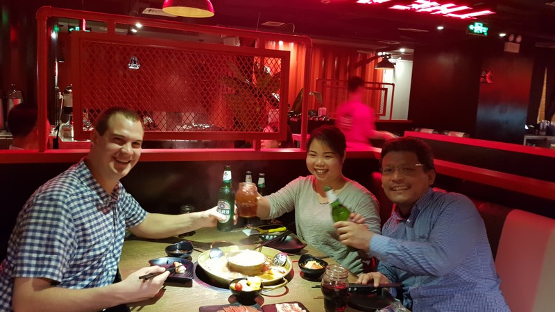 Doch erst einmal hatte ich noch den ganzen Sonntag Zeit um mich mit meinem Kumpel Dennis aus der Technikerschule in Shanghai zu treffen und ein wenig die Stadt unsicher zu machen. Shanghai Tower, Bootsfahrt, Parkbesichtigung, Koreanisches BBQ und, na klar das Feierabendbier durfte nicht fehlen. Schon beknackt wenn man sich mal vorstellt, dass man es kaum schafft sich in Deutschland zu treffen, aber wenn wir unterwegs sind dann halt mal in Shanghai. Wer weiß wen ich dort in Zukunft noch so treffe.