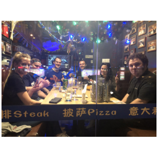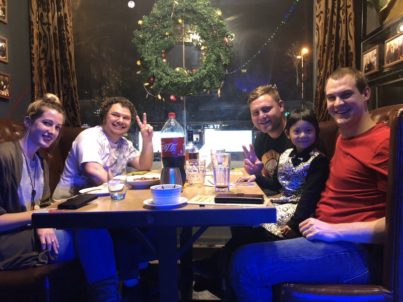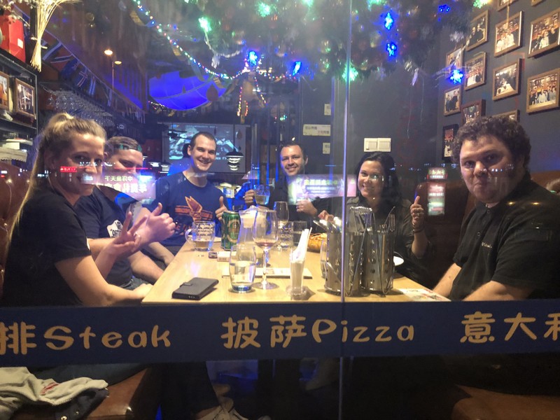Bevor ich nach Hause fliegen konnte verbrachte ich noch knapp eine Woche alleine auf der Baustelle und suchte jeden Tag nach neuen Ideen der Abendgestaltung. Ich fing an kleine Clips für ein „Langeweile Video“ zu drehen. Es entstanden jede Menge Szenen im Hotel ( ich will jetzt nicht eure Gedanken hören können) und dann ging es mal wieder ab in David´s Restaurant. Kurz vorher schaltete ich die Kamera aus und schaute kurz durch die Scheibe ob da jemand an unserem Tisch sitzt. Und wie sollte es anders kommen? Der Tisch war komplett besetzt und erst im Restaurant bemerkte ich, dass es sich endlich mal nicht um Chinesen handelte. Ich ging rein und lies es mir nicht nehmen die fünf neuen Gesichter an zu quatschen – Was hatte ich schon zu verlieren? Kurzer Schnack und zack holte ich mir noch einen Stuhl mit an den Tisch. Da saß ich nun mit Liebe (ja sie heißt so!), Dewald, Janet, Frik und Charles an einem Tisch. Sie kamen aus Südafrika und Amerika nach Hai´an um die Kids zu unterrichten. Wir erzählten uns gegenseitig unsere Geschichten vom Reisen, unserer Heimat, von unseren Jobs und unseren Erfahrungen aus den verschiedenen Ländern. Es war wirklich interessant die Erfahrungen und Eindrücke aus ihren Heimatländern zu hören, während wir für David die beste Werbung im „Schaufenster“ waren.